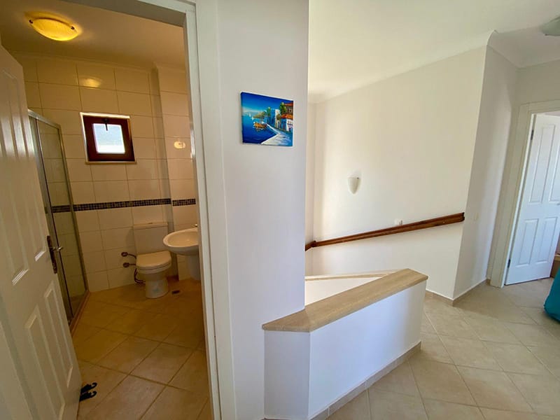 Stairs lead up to the first floor. Here you will find three spacious double size bedrooms, all of which enjoy access onto fabulous balconies enjoying wonderful views of the surrounding scenery. The master bedroom has its own en-suite bathroom, a dressing area and enjoys a beautiful view of the Aegean Sea. There is also a full tiled family bathroom on this floor.