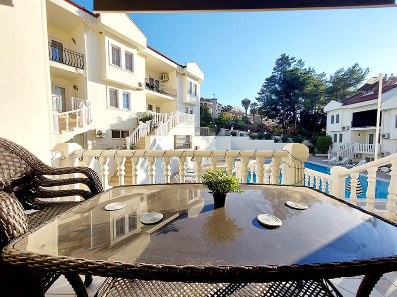 This delightful Duplex for sale in Fethiye offers a spacious lounge with access onto its own private balcony and a separate fully fitted kitchen with a dining space which also has access to a balcony which overlooks the communal pool area.