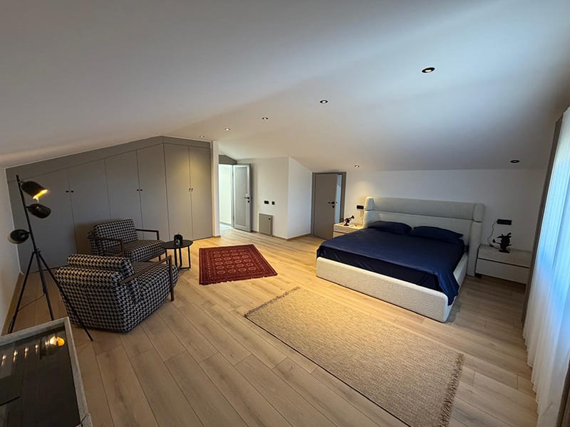 Again stairs lead to the top floor where there is a spacious double bedroom and en-suite luxury bathroom. It boasts a dressing room and has plenty of storage space. This room is large and also has plenty of room for seating or a corner can be used for office space.