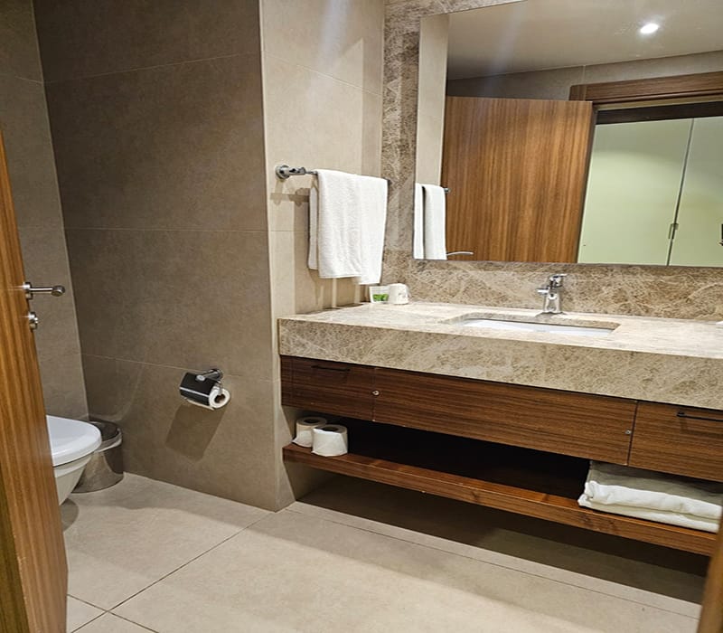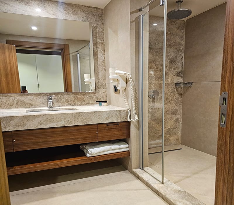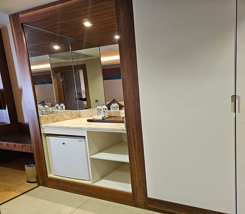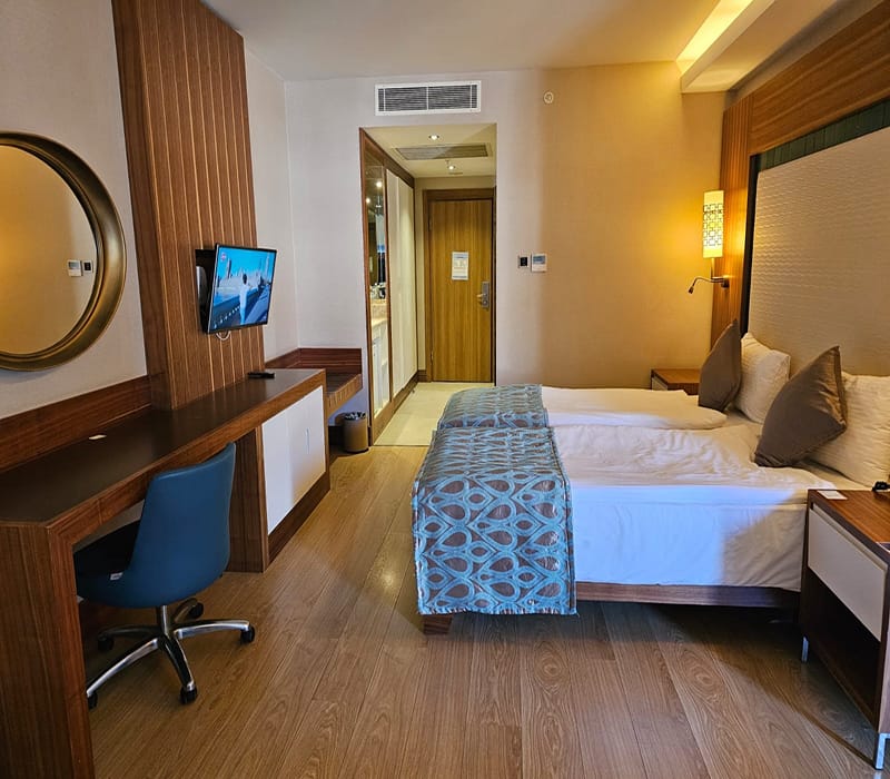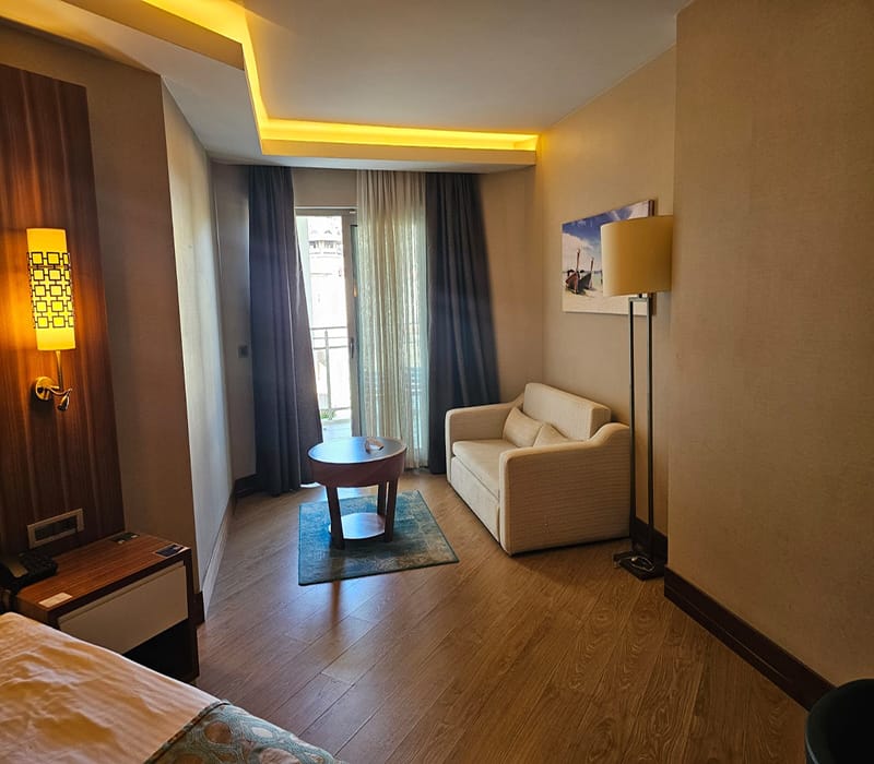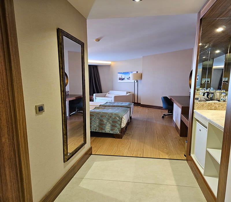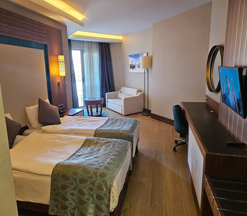 This Front Sea View Facing Suite, Kusadasi is all in one room and consists of twin beds, a seating area with a sofa and coffee table, a large built-in unit/work desk along the back wall and plenty of storage. There is also a modern fully tiled bathroom complete with a walk-in shower.