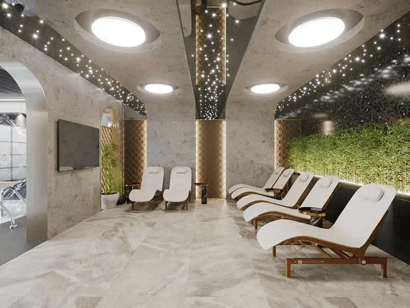 The complex features both indoor and outdoor communal swimming pools, a children’s playground, a BBQ area, a fitness room, a sauna, steam room and Hammam. There is also a cinema room, a karaoke room, table tennis and billiards. The complex comes with off-street parking, a guard on-site and 24 hour security cameras.