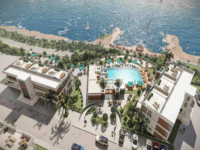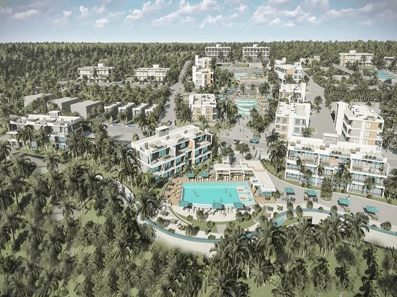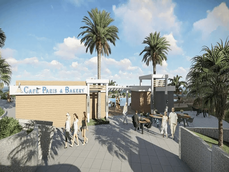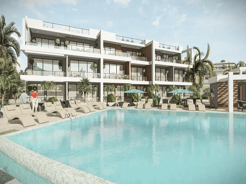 The complex features both indoor and outdoor communal swimming pools, outdoor play areas for children, a gym, cafes, restaurants, a beach bar and more.