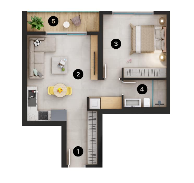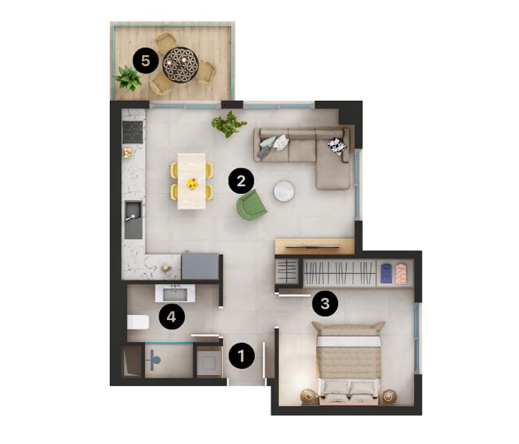 These one bedroom Apartments for sale in Alanya come with air conditioning infrastructure, double glazing on all windows, sliding doors to balconies, under-floor heating, ceramic tiled flooring, built-in spot lighting, video phone entry system, steel security doors, WiFi and TV satellite infrastructure and smart home system. You can control some of the features with a control touch panel or mobile phone. You can use the device to control the lighting, air con, under-floor heating, curtain control, water and smoke and alarm systems.