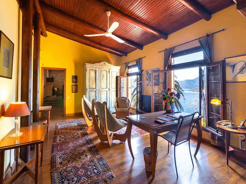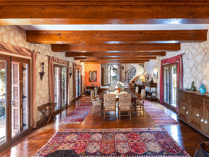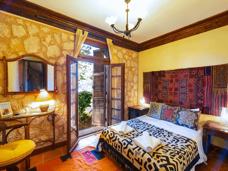 This stunning sea view Villa in Kas is very rustic in its design and is filled with amazing and beautiful features. It enjoys hard wood flooring, wooden beams on the ceilings, stone walls and wooden shutters on all windows and a lovely fireplace. The property comes with air conditioning, central heating and is fully equipped throughout with everything you could possibly need.
