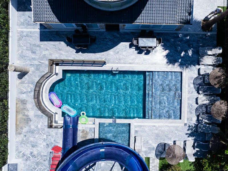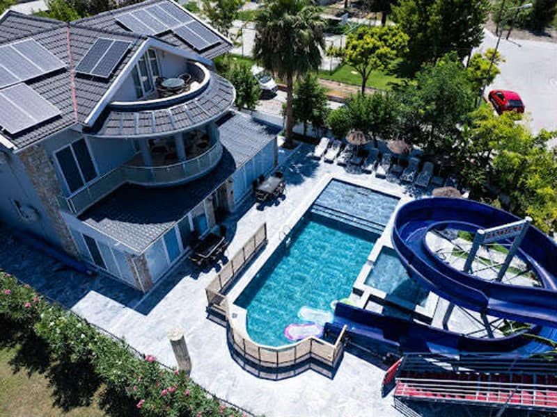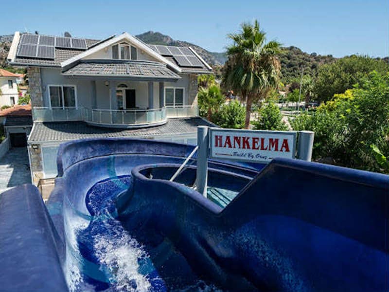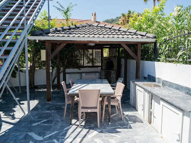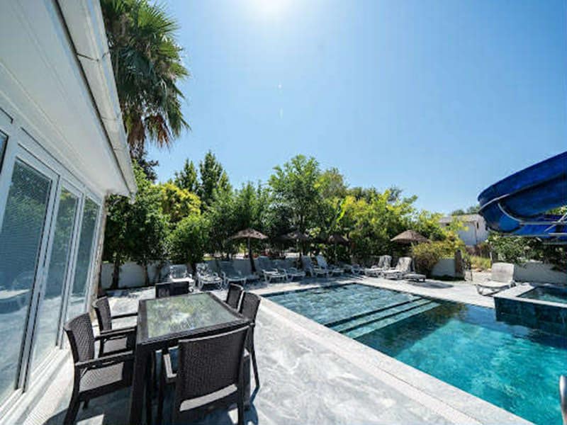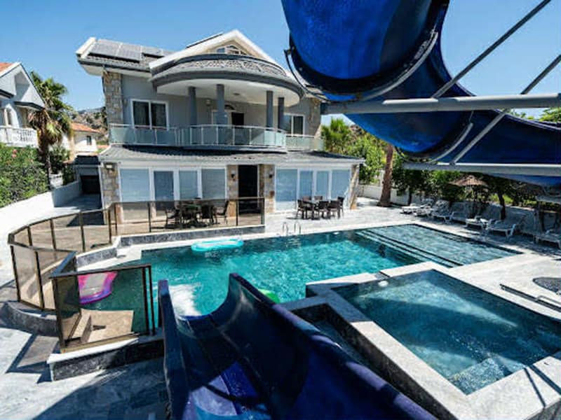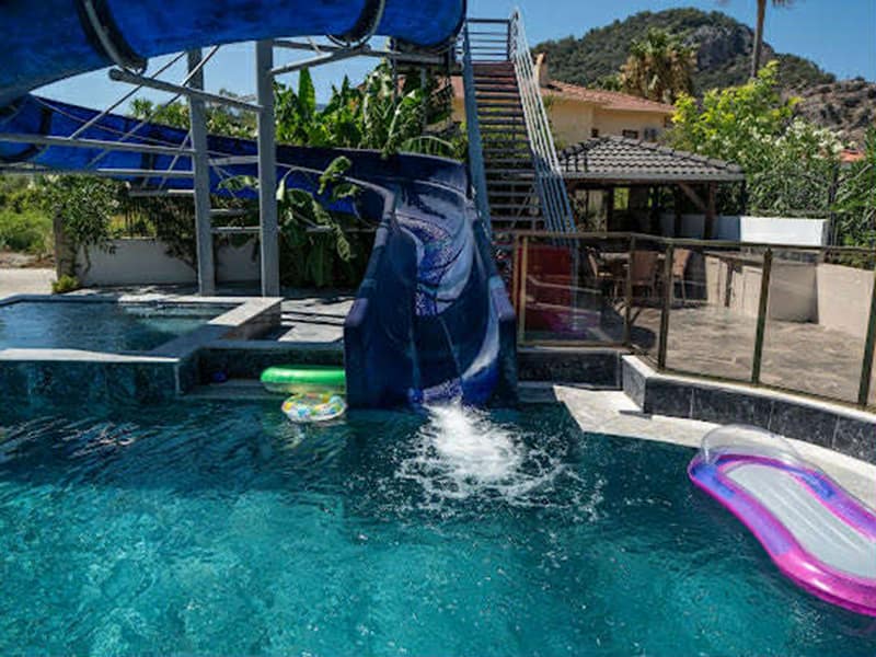 The main feature of this gorgeous Villa has to be the large private pool and fantastic waterslide. This outdoor space is exceptional. Set in landscaped gardens with mature trees and plenty of sunbathing areas along with sunbeds and umbrellas, to relax and soak up the Dalyan sunshine. The huge terrace has plenty of seating where you can dine outside and take advantage of the summer kitchen. Next to the summer kitchen is plenty of seating along with a pergola ideal for when you need shade.