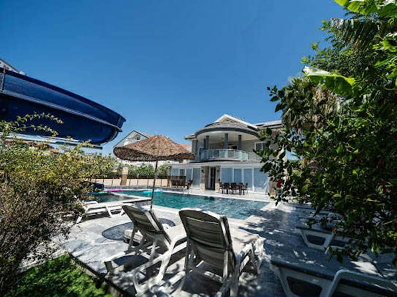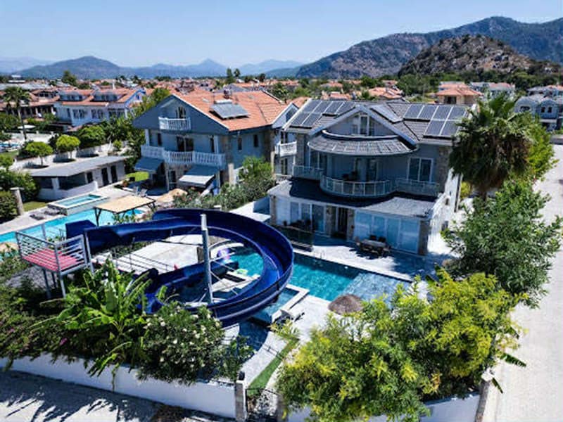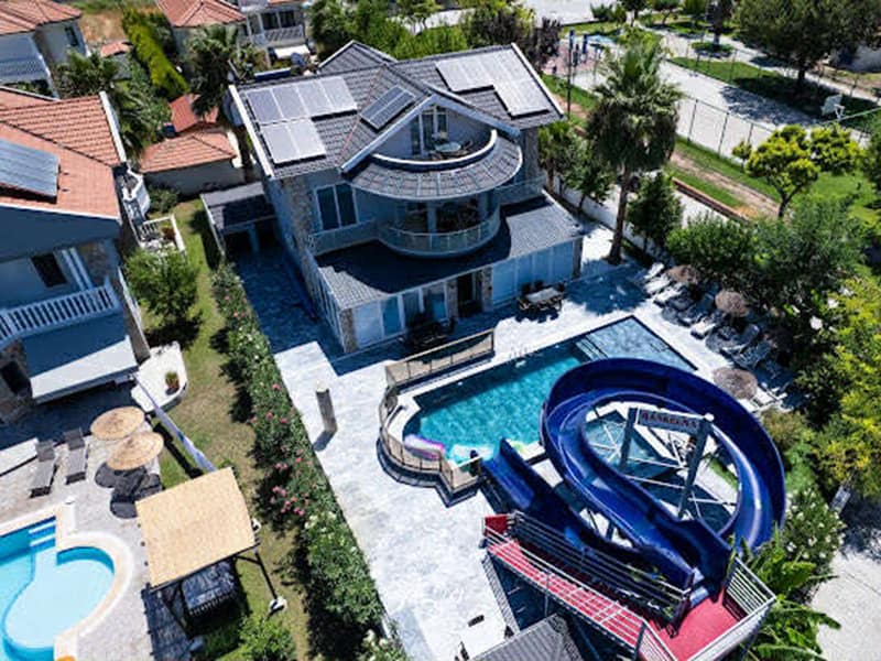 We have for sale this commanding six bedroom Villa in pretty Maras, Dalyan, this residential location is close to the river and within easy walking distance to the centre of Dalyan with its shops, bars and amenities. This magnificent Villa is exceptionally large and can easily accommodate a large family or group of friends. Its modern design offers spacious rooms and the outside space has a fabulous private pool along with a large waterslide ensuring plenty of fun in the sun.